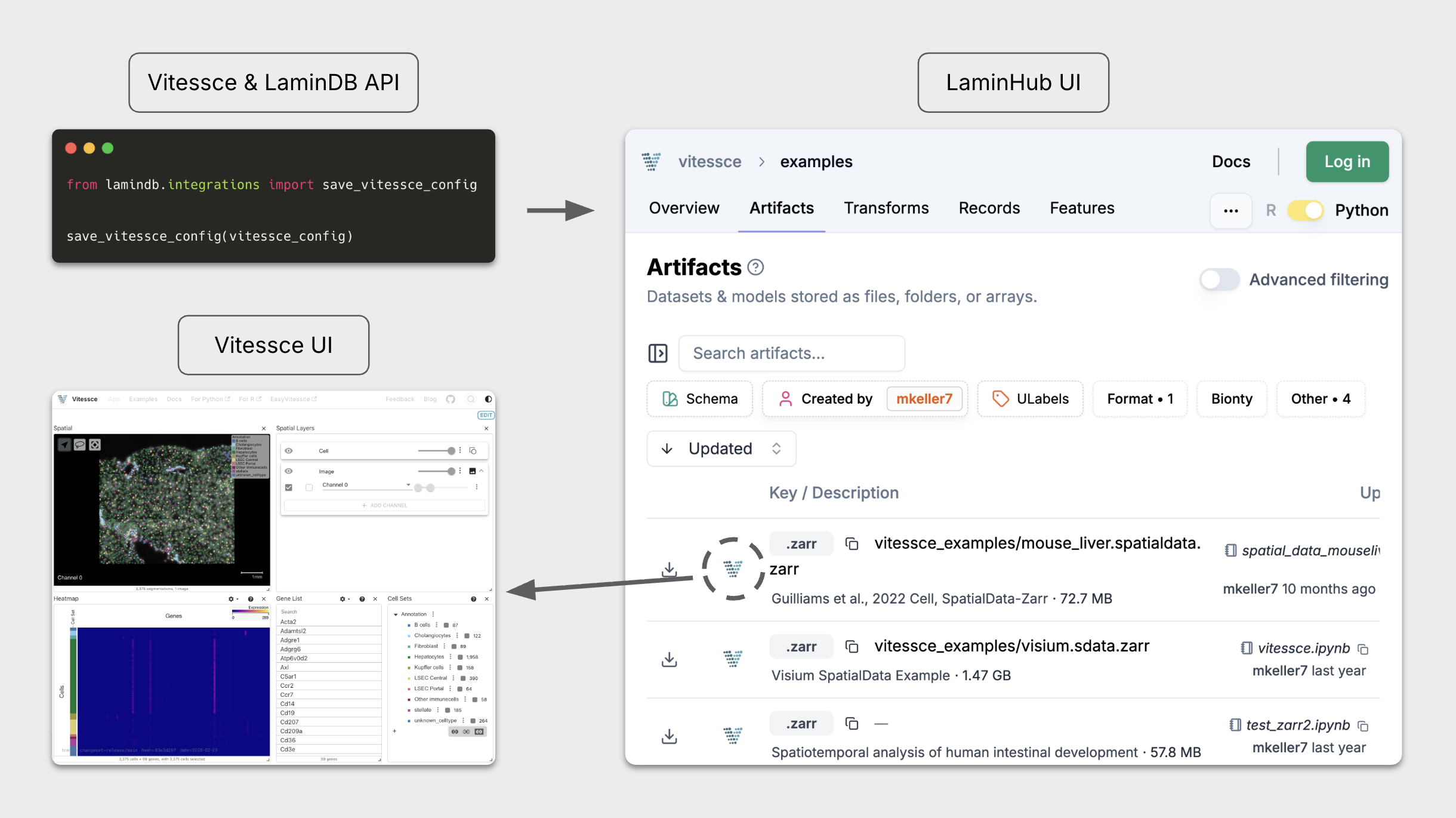 Through the integration with LaminDB, the vitessce Python module now supports building configurations directly based on LaminDB artifacts, which are tracked, validated, and queryable and let the user focus on the entities they care about – genes, experiments, cell types, samples, etc. – rather than storage paths.